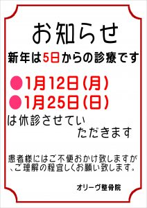 来年も皆様の健康に貢献できるよう全力でサポートさせていただきますので引き続きオリーヴ整骨院をよろしくお願いいたします。